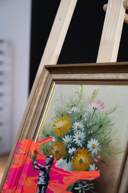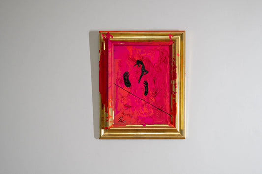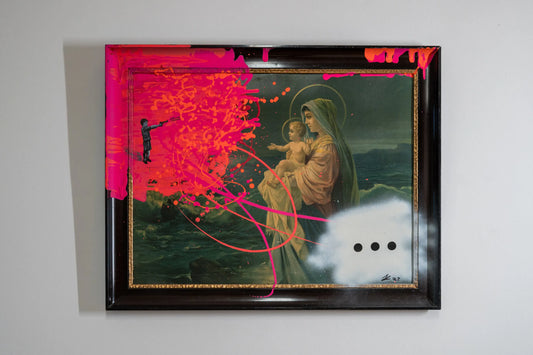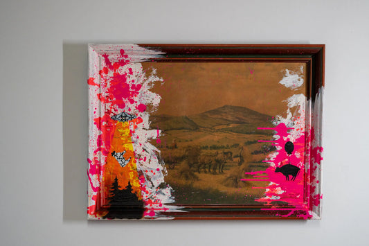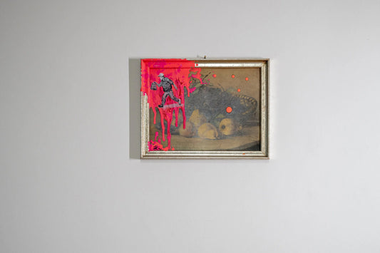 In der Serie Classical Disruption setze ich mich mit der spannungsreichen Wechselbeziehung zwischen Vergangenheit und Gegenwart auseinander. Jedes Gemälde beginnt mit einer friedvollen klassischen Landschaft oder einem Stillleben, das dann durch moderne Elemente gestört wird, welche das chaotische Eindringen des zeitgenössischen Lebens und Konsums in die zeitlosen Idyllen der Vergangenheit suggerieren. Die herablaufende Farbe symbolisiert das Überschwappen moderner Einflüsse und die oft unordentliche Wechselwirkung zwischen Tradition und Fortschritt. Mit leuchtendem Pink und expressiven Klecksen, die sich über pastorale Szenen und ruhige Obstarrangements legen, möchte ich zum Nachdenken über die Entwicklung unserer Beziehung zu Nahrung, Natur, Umwelt und Wertsystemen anregen. Es werden Fragen der Nachhaltigkeit, des Konsums und unserem Abweichen von den Ursprüngen dessen, was wir essen, aufgeworfen.